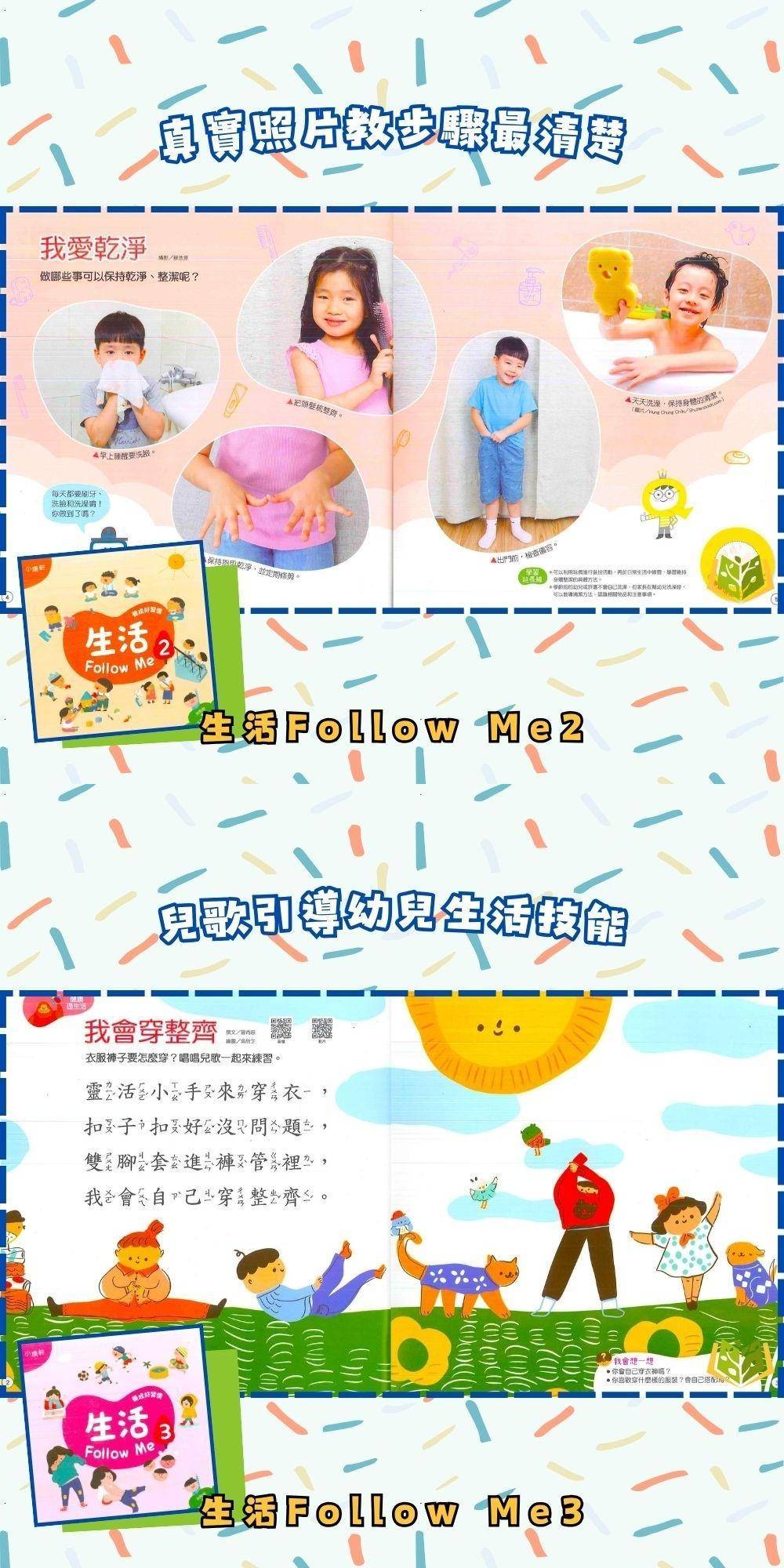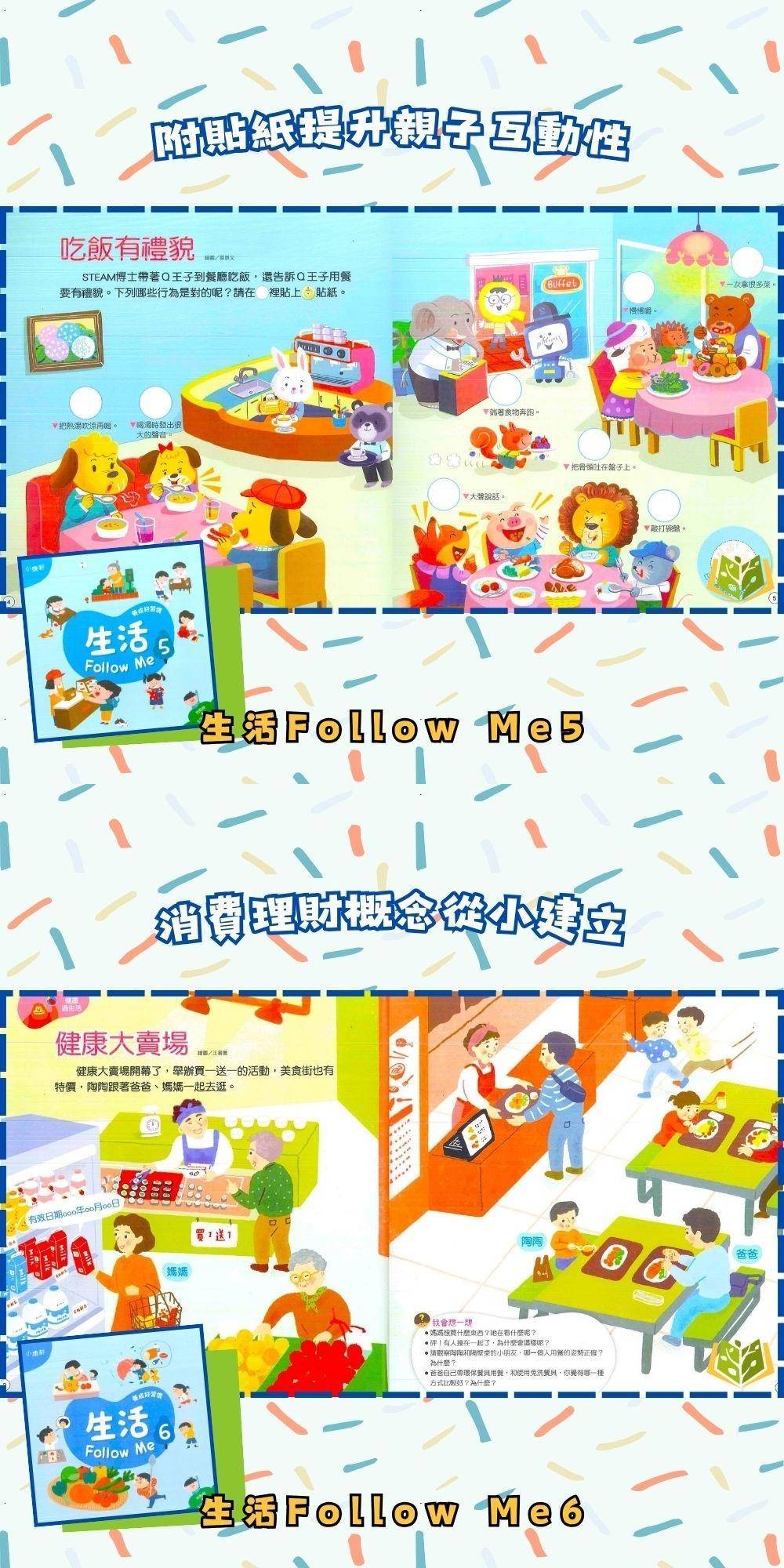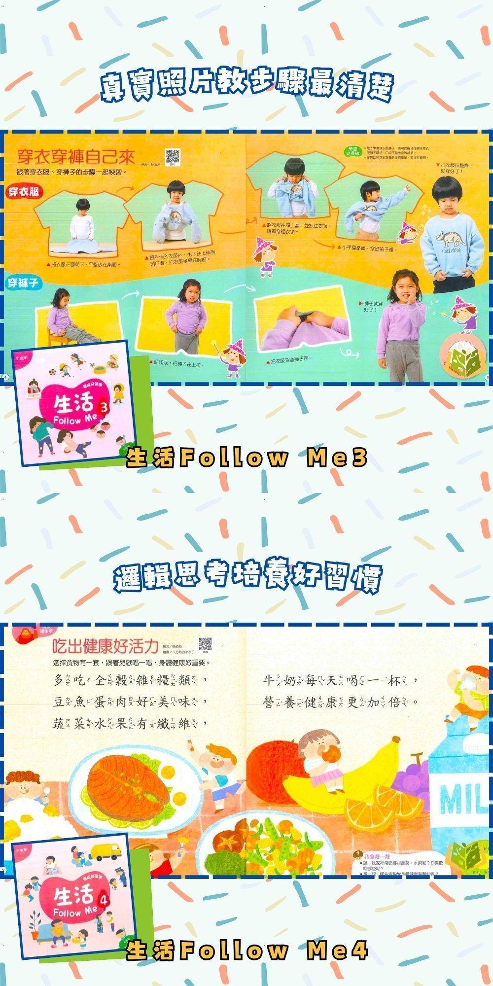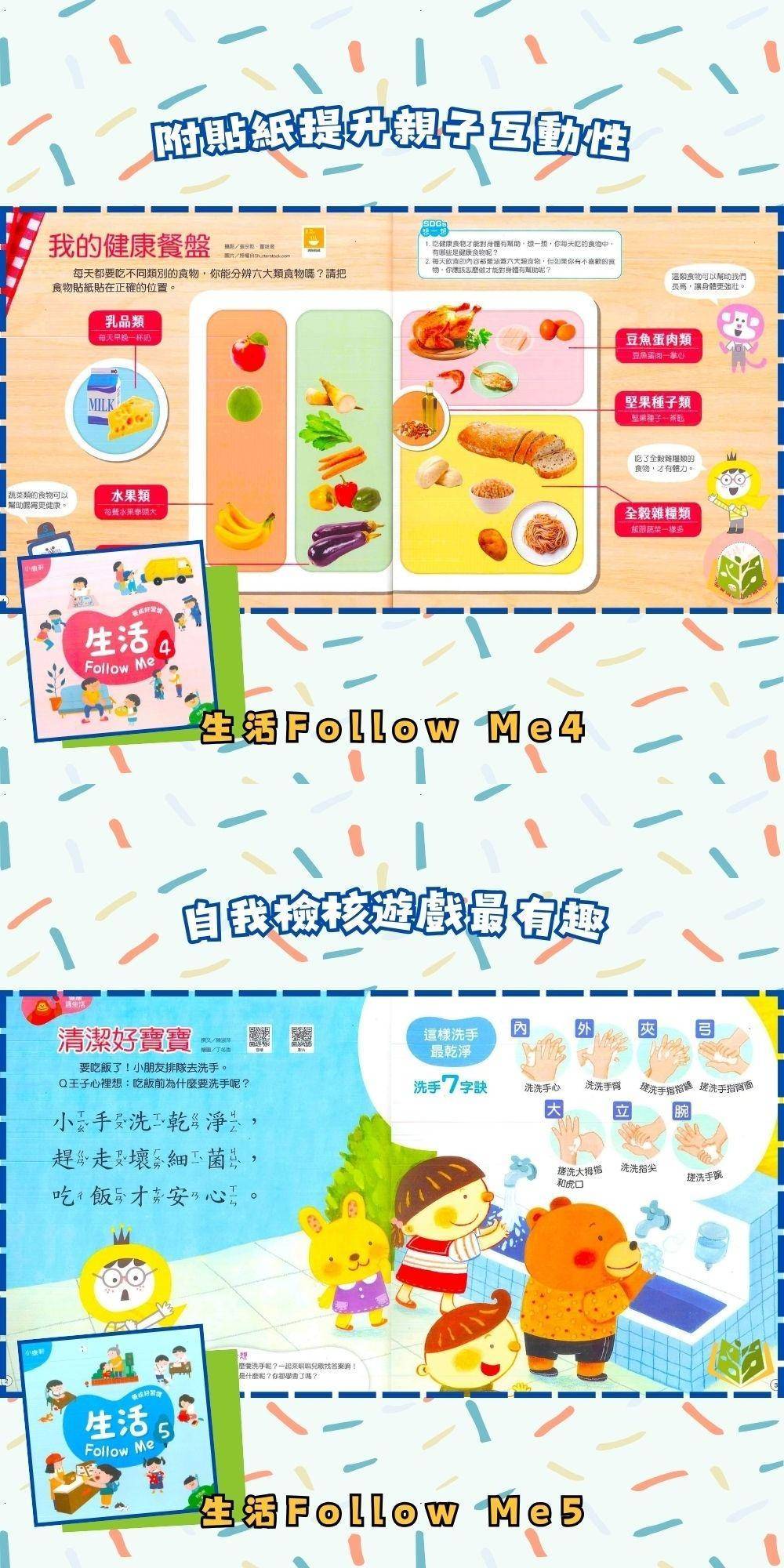🔸內頁搭配貼紙,幫助幼兒複習與檢核學過的概念和知能,吝提供生活自理影片