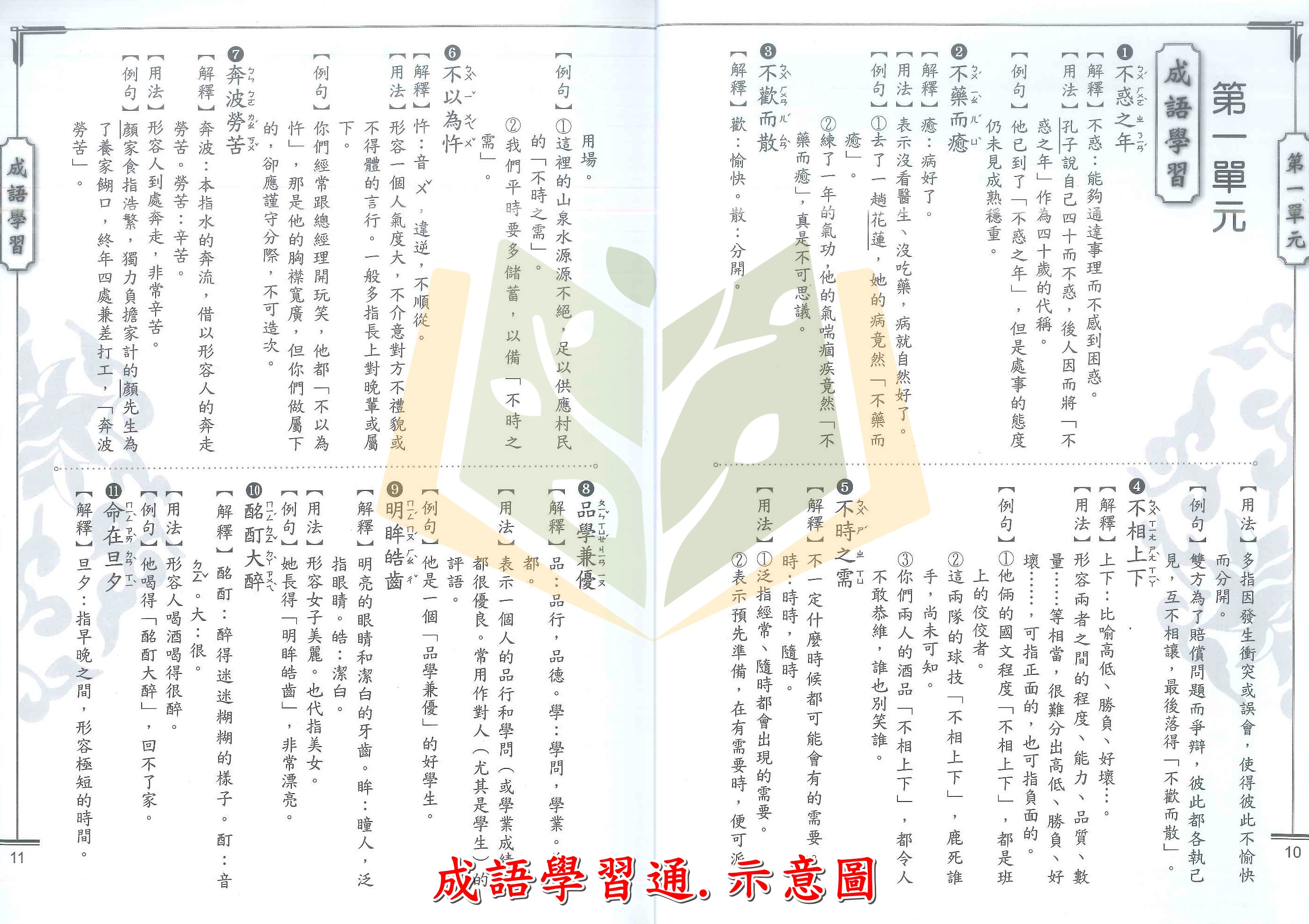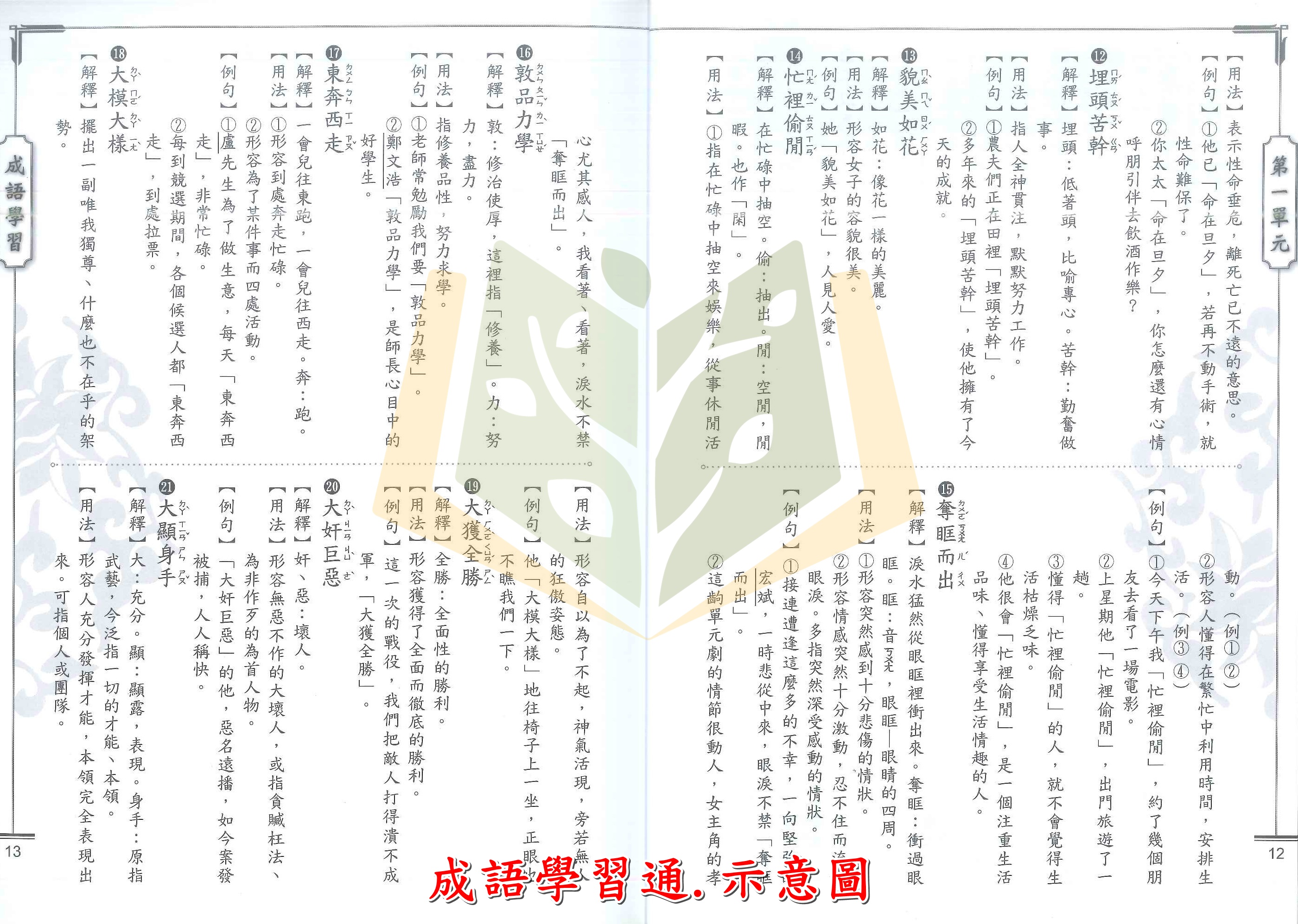 每個成語都有清楚例句、用法解析,幫助學生理解意思、避免誤用。